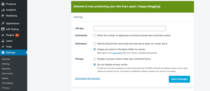 After activating Akismet, you can configure it by navigating to Settings > Akismet Anti-Spam. There, you can specify whether Akismet should automatically discard the “worst and most pervasive spam“: