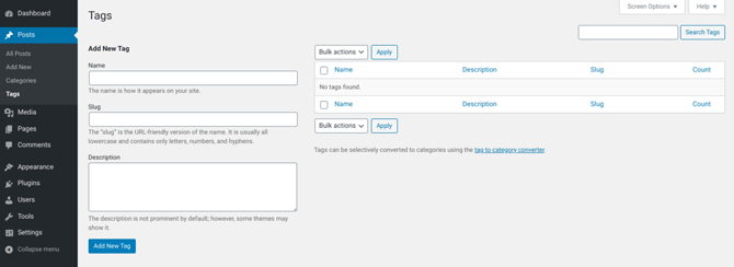 Then you can either select Add New Category, or enter your new tag into the Add New Tag field. Alternatively, you can create new tags and categories by navigating to either Posts > Categories or Posts > Tags: